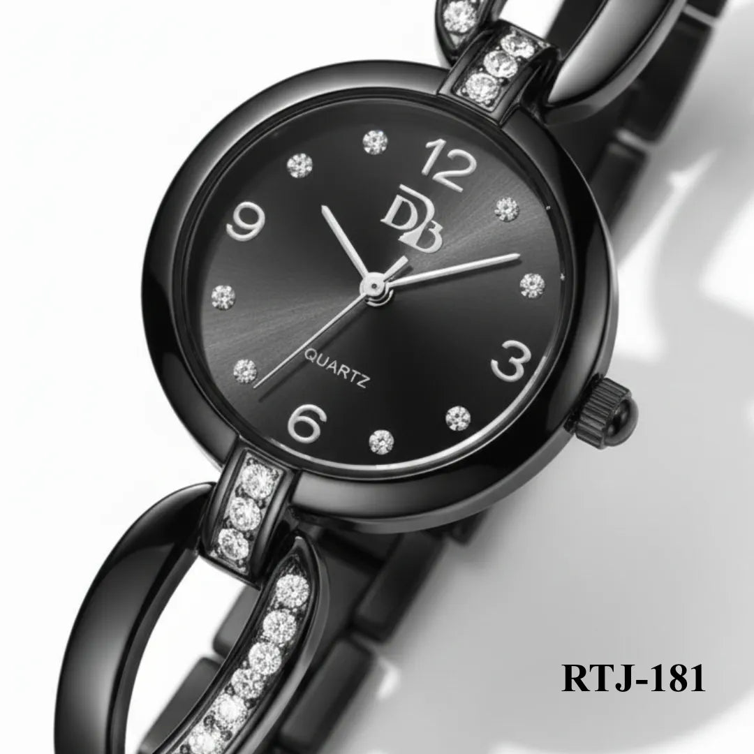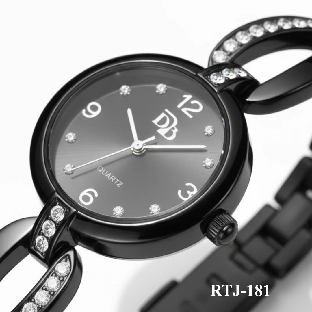 Embrace sleek sophistication with the Golden Zircon Designer Watch. This striking timepiece features a stylish black finish, often applied to the case, band, and/or dial, providing a modern, monochromatic look.